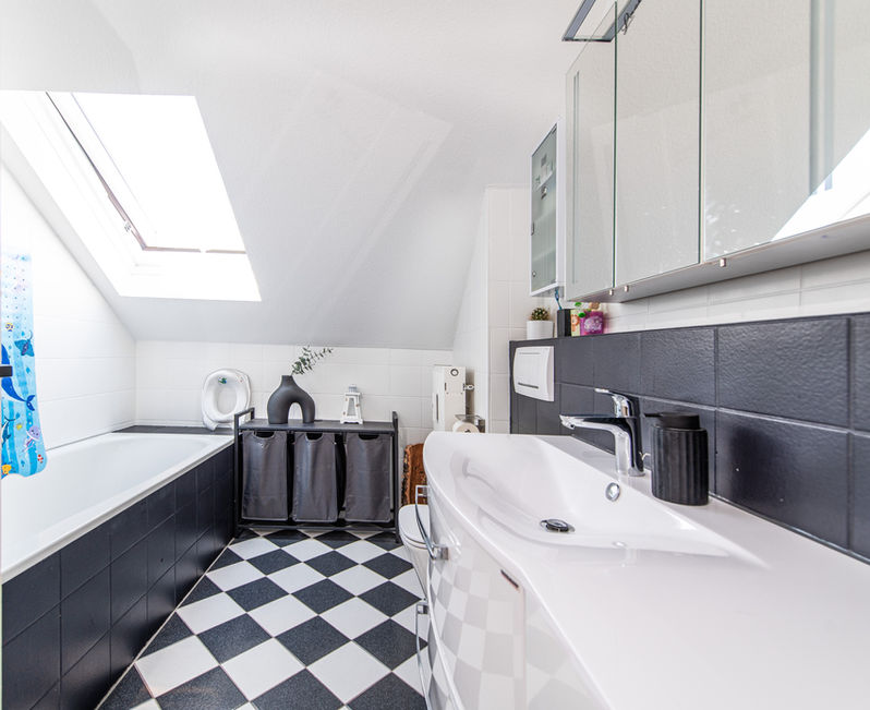 Das Tageslichtbad überzeugt durch hochwertige Ausstattung, inklusive einer neuen Duschkabine aus Echtglas. Die Toiletten und die Betätigungsplatten sind ebenfalls neu. Die Armaturen von Hansgrohe können bei Interesse ebenfalls übernommen werden.